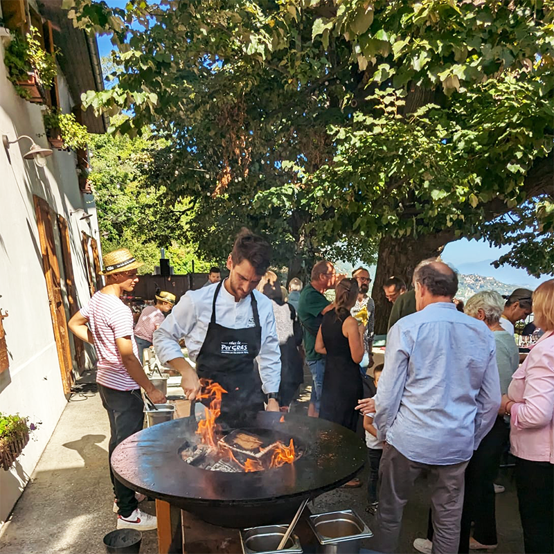 Nous avons pu déjeuner sur la terrasse et profiter d’un beau buffet mêlant ateliers culinaire et cuissons de côte de bœuf au braséro le tout accompagné par le groupe de musique Tom’Ng.
