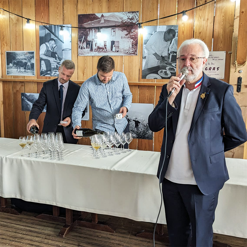 De retour au restaurant, nous avons pu profiter dans un premier temps de l’expertise de Monsieur Philippe Faure-Brac meilleur sommelier du monde en 1992 sur les cuvée Le Papé 2020 (Chardonnay) et Les Grives 2020 (Verdesse). Son analyse a été non seulement flatteuse pour tout le travail réalisé ensemble mais également très prometteuse pour la suite. Ce sentiment a été confirmé par la dégustation des cuvées 2022. La météo nous joue des tours mais les résultats sont beaux, bons et qualitatifs.